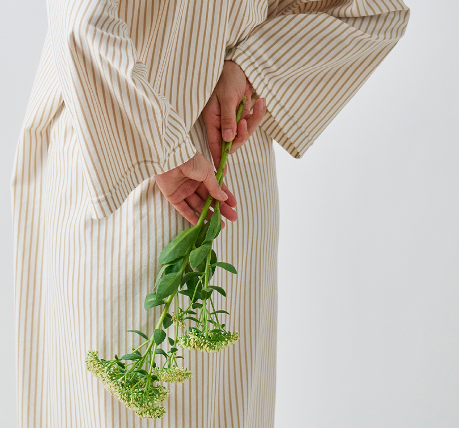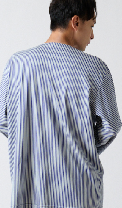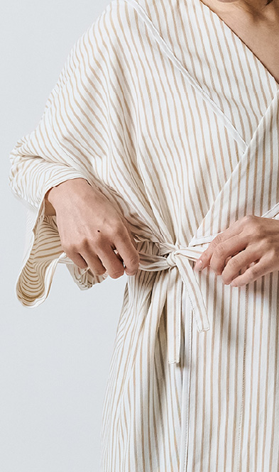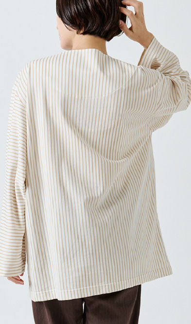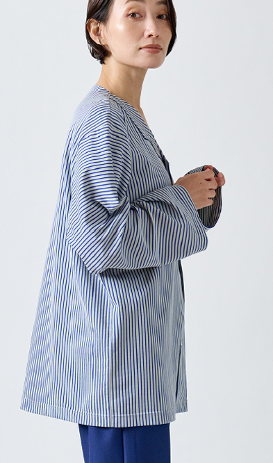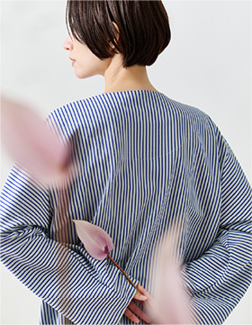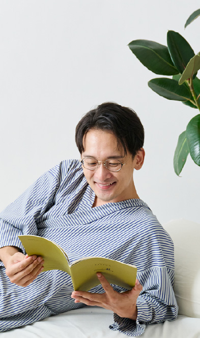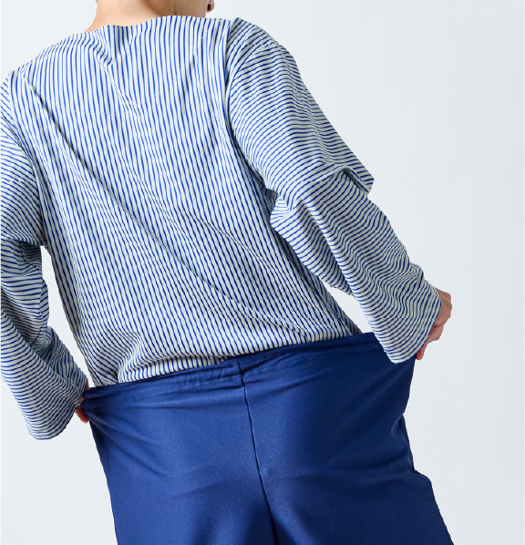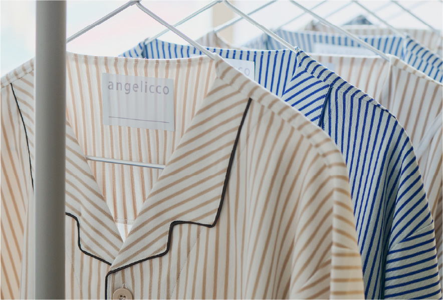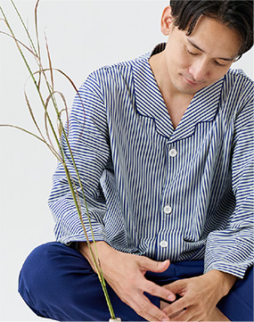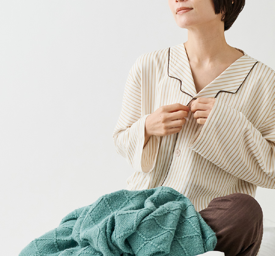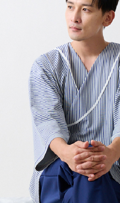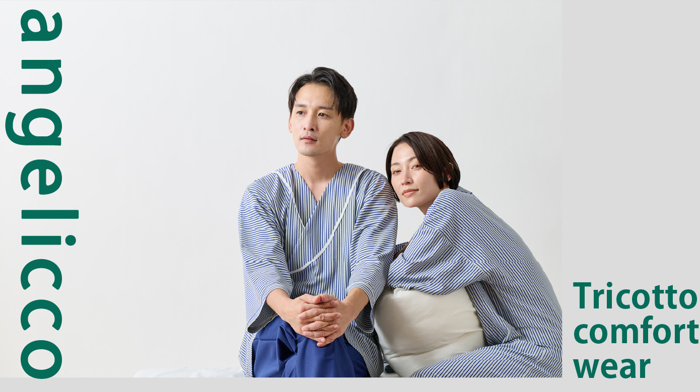 入院や療養の時間を心地よく過ごすために生まれた患者着。やわらかな綿混トリコット素材で、肌にやさしく伸縮性もあり、縫製を工夫することで、肘や膝の動きに自然に寄り添いながら型崩れしにくいデザイン。普段着のように優しく着ることができる快適なウェアです。