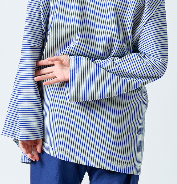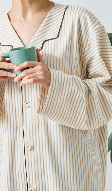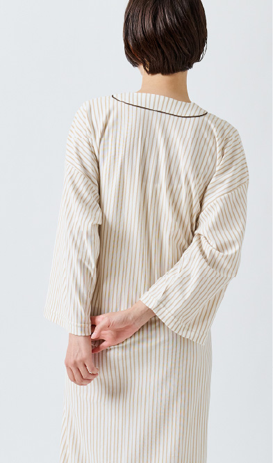 入院や療養の時間を心地よく過ごすために生まれた患者着。やわらかな綿混トリコット素材で、肌にやさしく伸縮性もあり、縫製を工夫することで、肘や膝の動きに自然に寄り添いながら型崩れしにくいデザイン。普段着のように優しく着ることができる快適なウェアです。